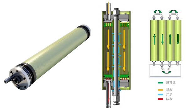 廢水從端頭直接進(jìn)水,經(jīng)過(guò)一個(gè)導(dǎo)流分配盤將廢水均勻的分配到膜組件進(jìn)料端面,在壓力作用下,透析液通過(guò)格網(wǎng)流入中間透析液收集管。其余截留廢水通過(guò)平行格網(wǎng)流出濃水管。膜組件通過(guò)串聯(lián)以實(shí)現(xiàn)水回收率的提高和能耗的降低。